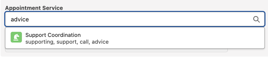 This allows for the selection of Appointment Service(s). You can add an Appointment Service by typing the name of the service, or by using any key words configured within the service. For example: If you were adding Support Coordination, you could type Support Coordination, or, advice.