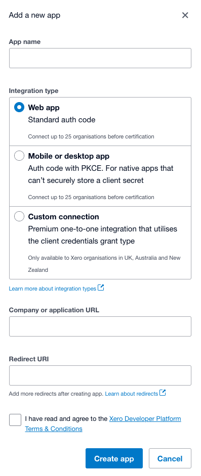 Using the links above, you can now create a custom Xero Web App. To do so, follow the link shown in the above image (or here: [developer.xero.com](https://developer.xero.com/app/manage)). Once on the link, you will be presented with the following screen:&#x20;