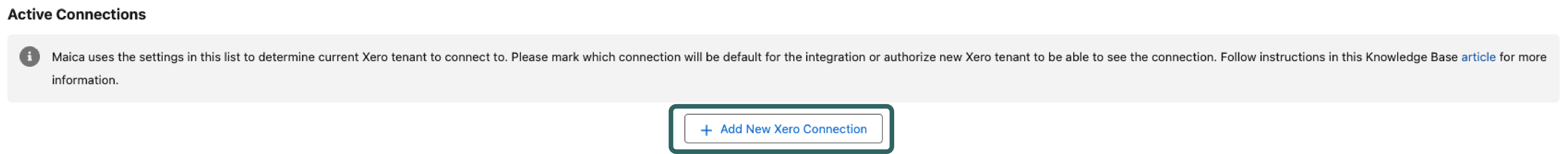 To do so, re click the `+ Add New Xero Connection` button in the `Active Connections` section, and follow the hyperlinks within **Maica**, as shown below.&#x20;