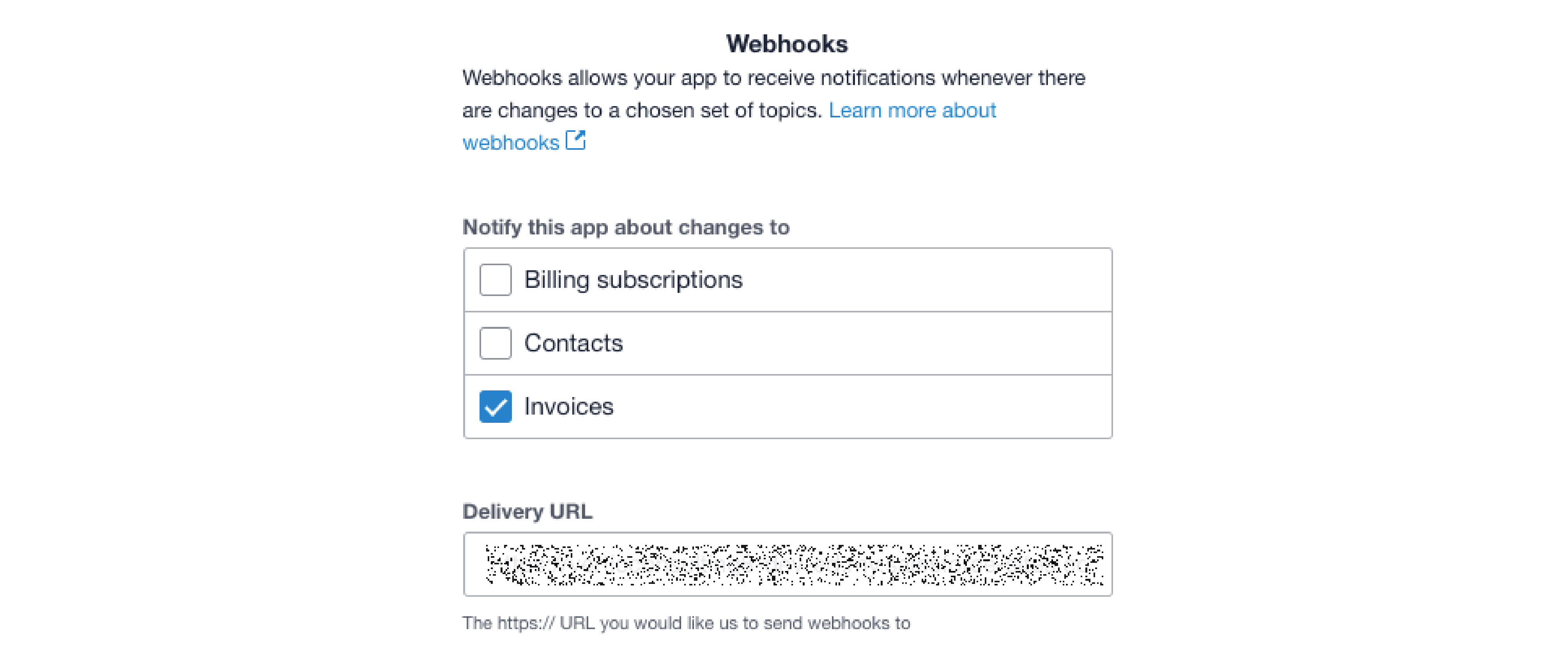 Maica is only connected to the Invoices webhook, so ensure that this is the only option ticked from the `Notify this app about changes to` options.