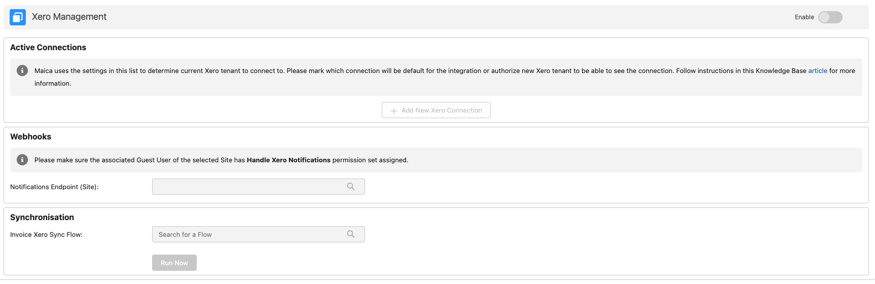 Before proceeding, make sure that the Xero Management toggle in the top right corner of your interface is set to `Enabled`, as shown below.