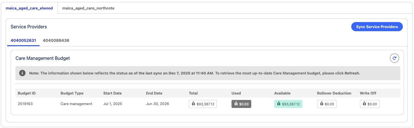 If your organisation operates **multiple Service Provider IDs**, each Provider ID is displayed as a **separate tab** within the Care Management Budget component. Selecting a tab determines which Service Provider ID is used for the sync and which Care Management budget data is displayed.
