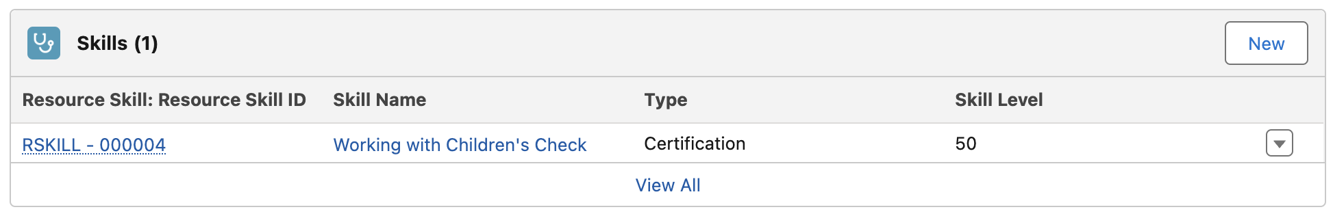 **Maica** offers the ability to globally record a set of `Skills` such as `Driving a Car` or `Administering Medicine`. Those Skills can then be assigned to Resources via the `Skills` related list as shown below.