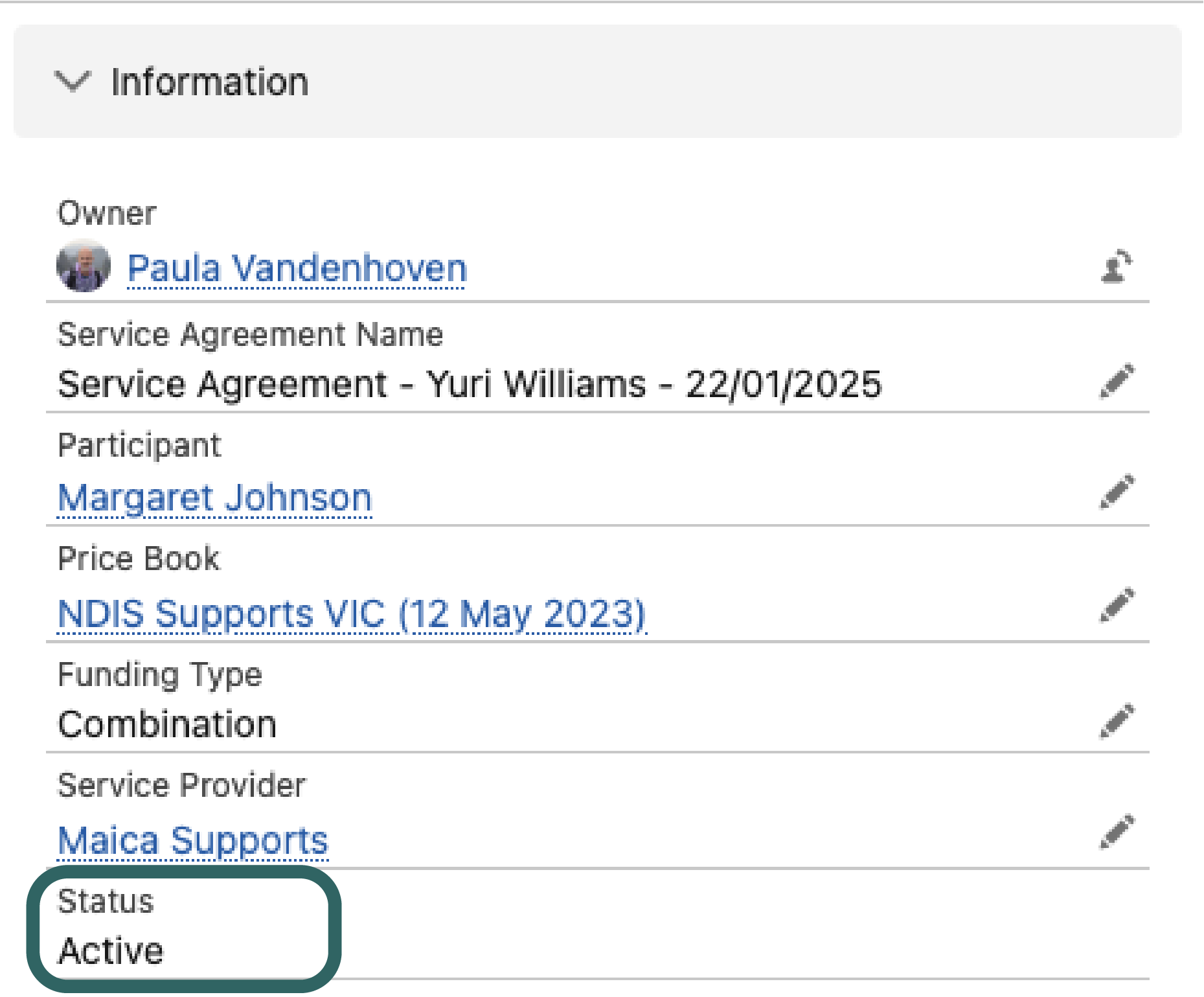 Whilst working with Service Agreement(s), you will notice a `Status` field at within the Information tab on the left of the page, as shown below.&#x20;