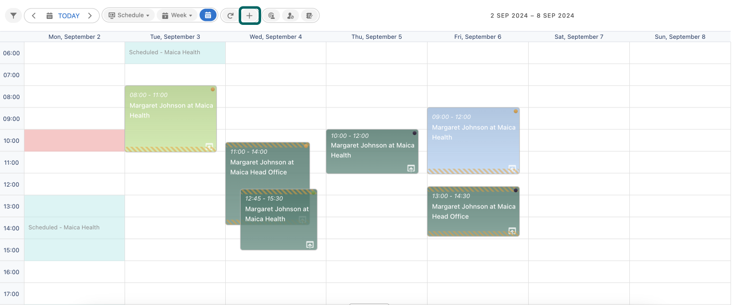 | [Schedule](https://knowledge.maica.com.au/maica-knowledge-base/the-planner/planner-views-and-modes/schedule)                    | `New Appointment` |