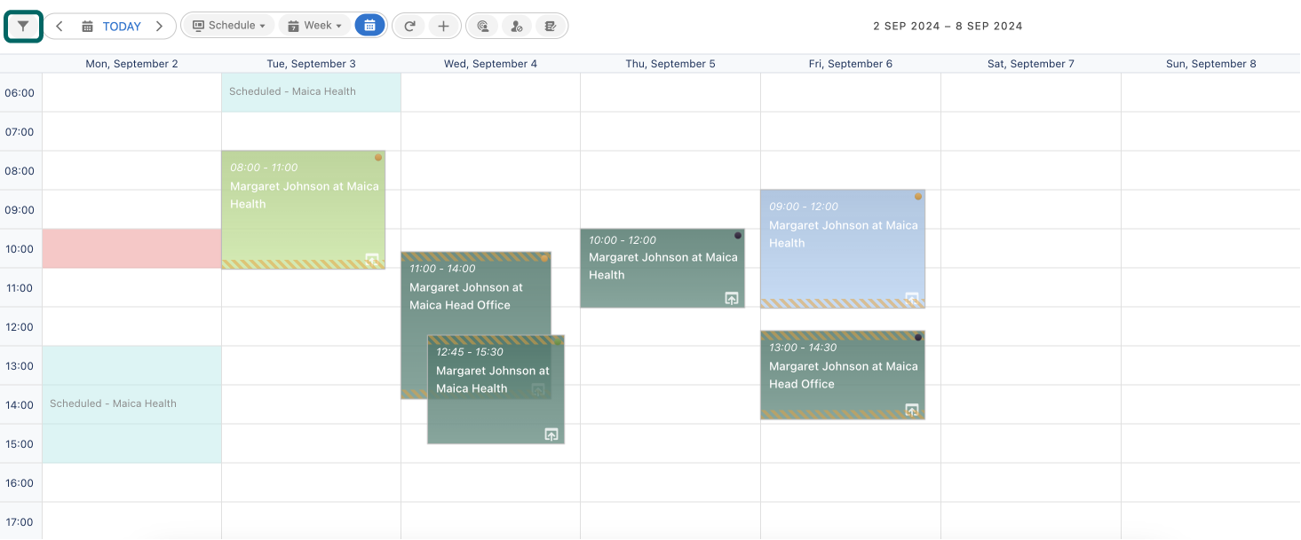 The Planner Filter in **Maica** is a tool that allows users to refine and customise the information displayed on the Planner. By selecting specific criteria, you can narrow down the view to focus on relevant information and data. The Planner Filter ensures that users can efficiently manage and organise Appointments, Shifts, Resources, and Participants based on the selected filters.