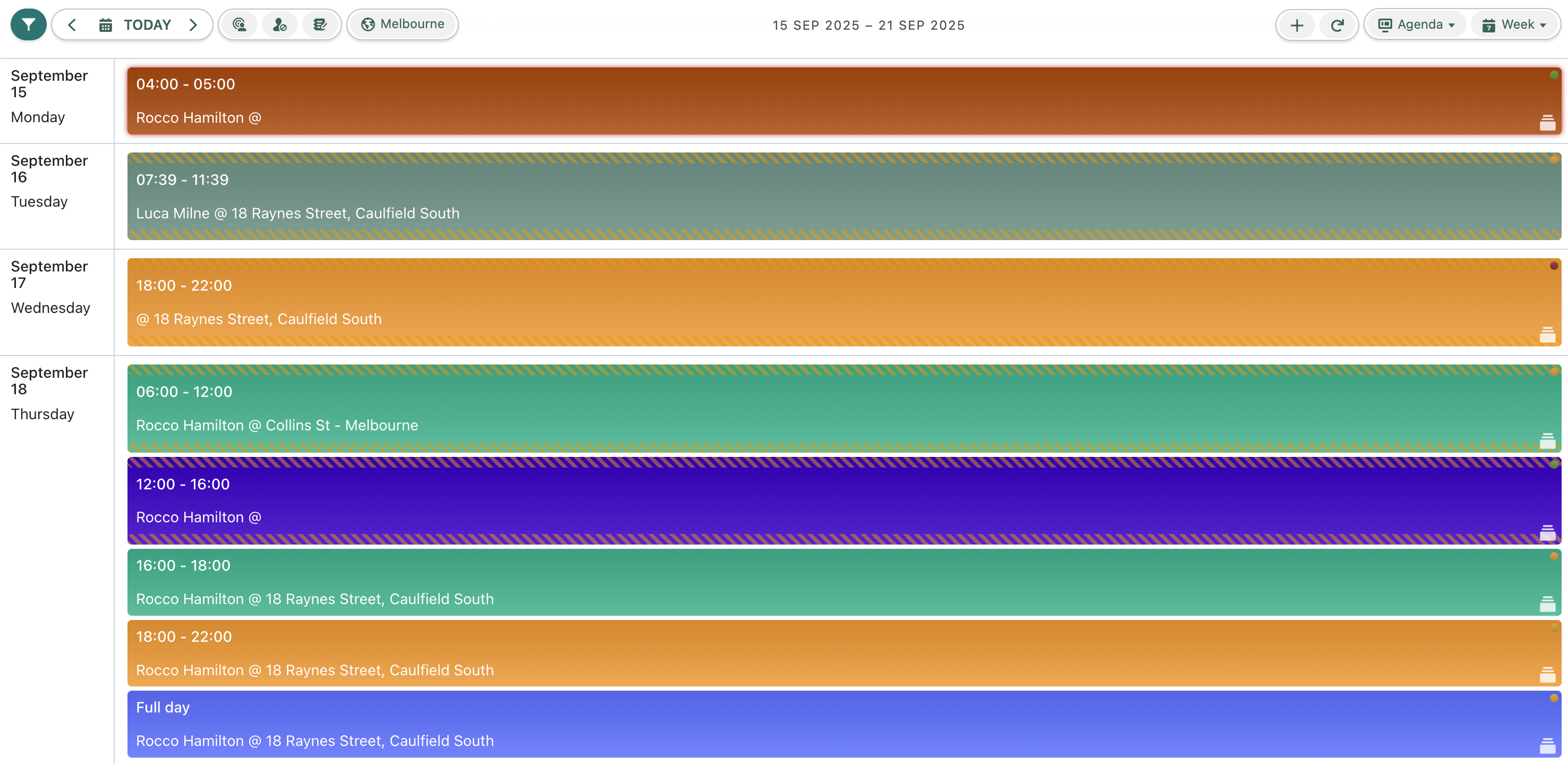 In Agenda Mode, your Planner information will be displayed within a scrolling list organised by date. Each day expands to show all of its associated **Appointments** and **Shifts**, with details such as: