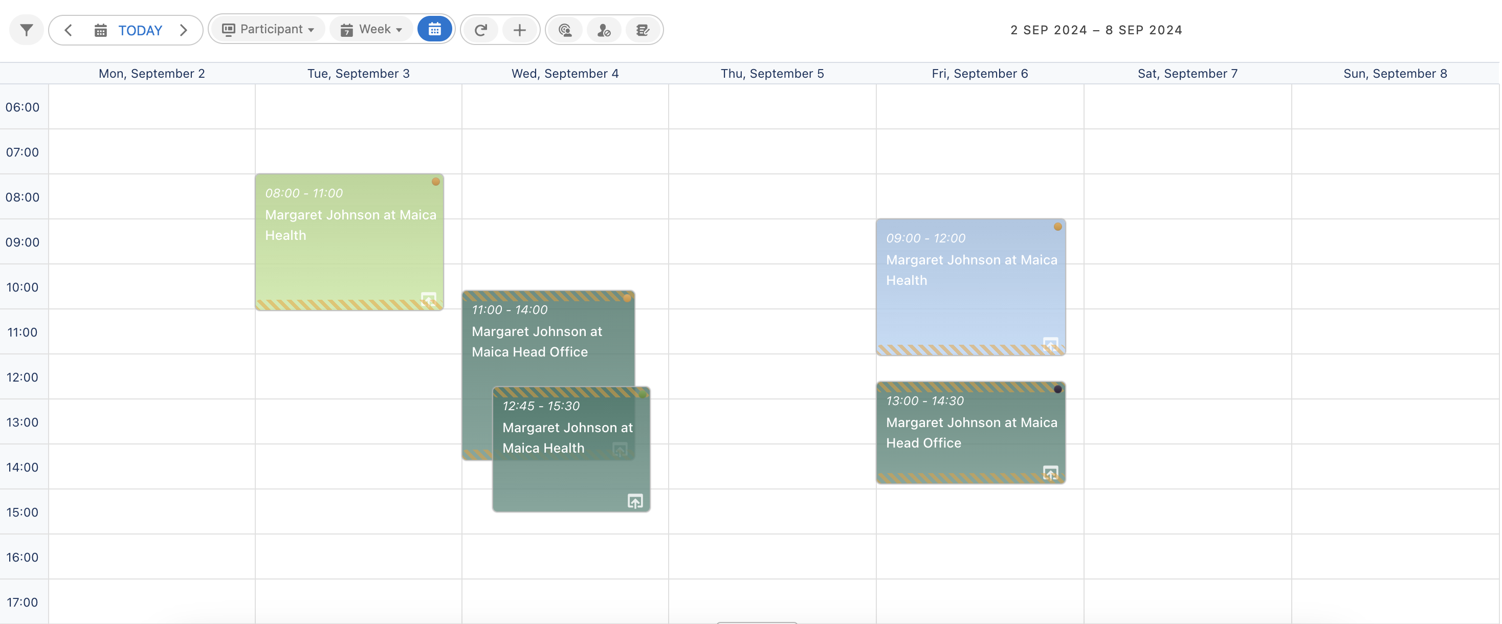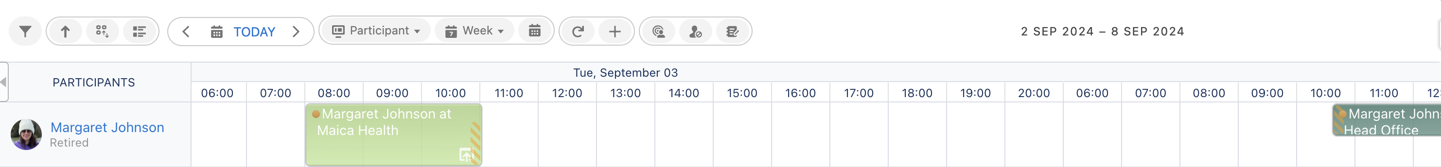 On Calendar Mode, Participant View will display your Planner with the above information within a grid based on the days and hours of the [selected period](https://knowledge.maica.com.au/maica-knowledge-base/the-planner/planner-views-and-modes/..#how-do-i-select-my-display-options-in-the-planner).&#x20;