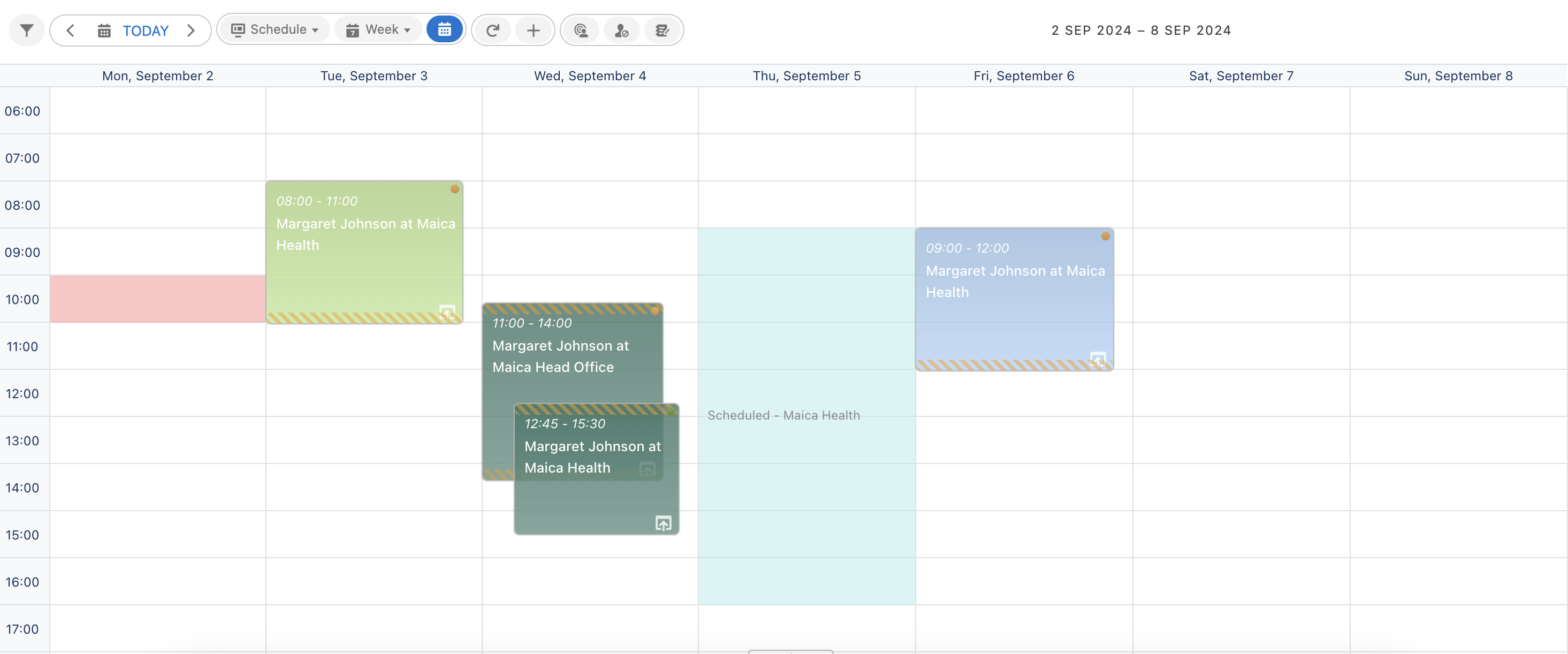 On Calendar Mode, Schedule View will display your Planner with the above information within a grid based on the days and hours of the [selected period](https://knowledge.maica.com.au/maica-knowledge-base/the-planner/planner-views-and-modes/..#how-do-i-select-my-display-options-in-the-planner).&#x20;