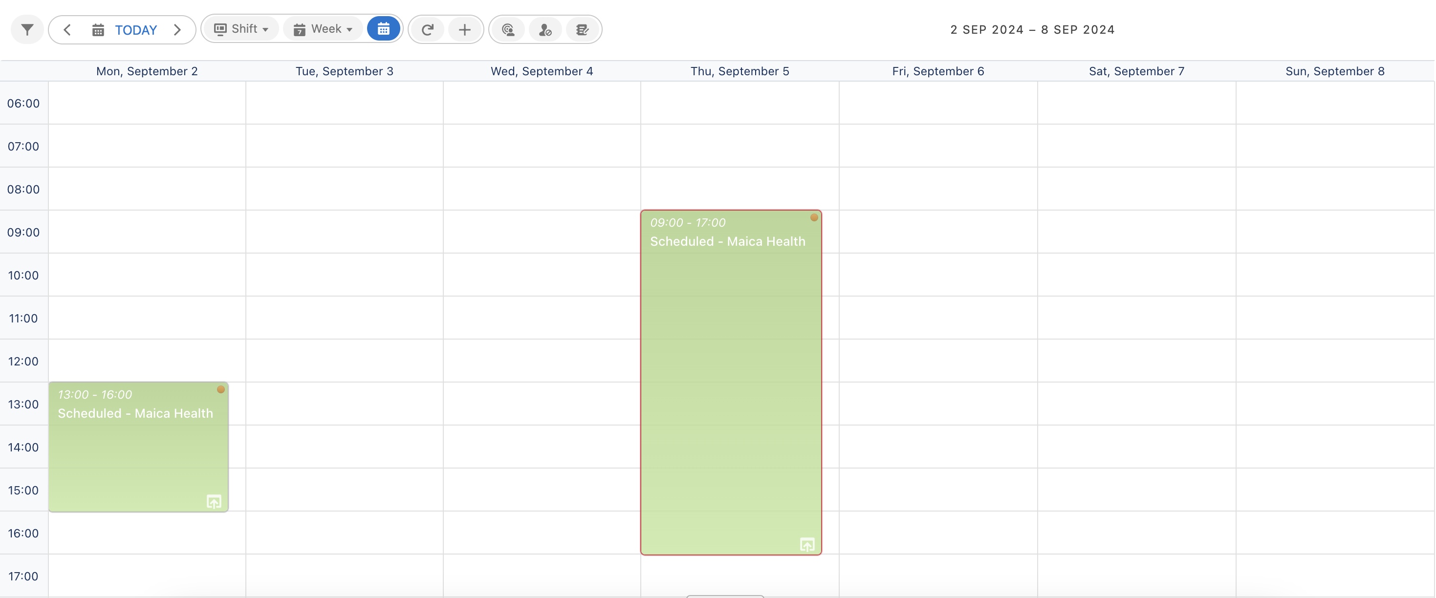 On Calendar Mode, Shift View will display your Planner with the above information within a grid based on the days and hours of the [selected period](https://knowledge.maica.com.au/maica-knowledge-base/the-planner/planner-views-and-modes/..#how-do-i-select-my-display-options-in-the-planner).&#x20;