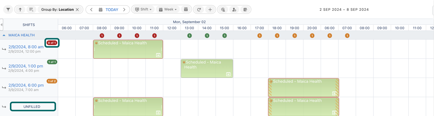Similar to [Roster View](https://knowledge.maica.com.au/maica-knowledge-base/the-planner/planner-views-and-modes/roster-view), If you use the `Group By` Planner Action, **Maica** will show helpful indicators on your Planner to inform you of how many unique `Shifts(s)` you have at any given time, as shown above.